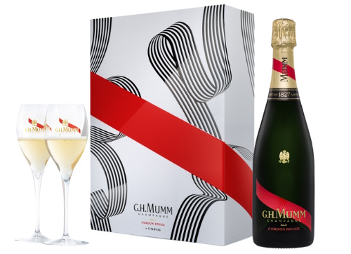 The newly designed Mumm Cordon Rouge bottle comes paired with two elegant branded flutes, beautifully presented in a premium gift box, perfect for celebrating or gifting.